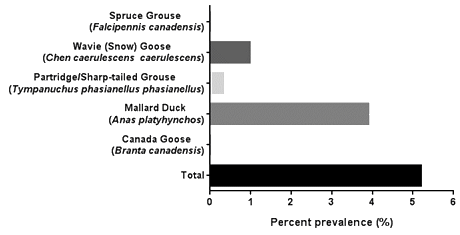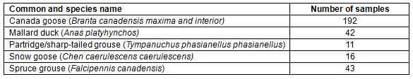 Table 1: Number of cloacal swabs, by wild game bird type, obtained in a remote First Nation community in subArctic Ontario, Canada, 2013 and 2014