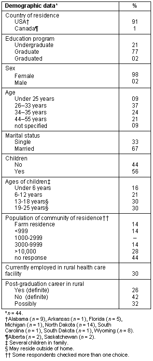 Regarding place of residence, 14% indicated they lived on a 'farm', 14% resided in towns having fewer than 1000 residents, 14% resided in communities ranging from 3000 to 9999, and 28% lived in communities that included over10 000 residents. (In some cases, respondents checked more than one option.) Most were married (67%) and had children, ranging in age from under six to 25 years. Of the sample, 30% were employed in a rural health-care facility while attending school and the majority of them planned to continue working in those facilities after completing their education. As for post-graduation plans, 26% definitely planned to continue working in rural places while 42% indicated that definitely was not in their plans; 32% were uncertain about their post graduation employment setting. Of those who indicated they were not planning to work in rural sites, the investigators assumed they were familiar with that kind of practice by their comments and because they were attending an international conference specifically focusing on rural nursing. For that reason their comments were included in the data analyses.