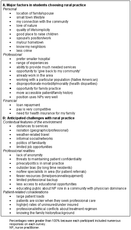 Of the 14 items on the survey, 11 elicited demographic data related to the respondent's place of residence and education. The remaining items consisted of open-ended questions that elicited short answer responses regarding major factors that contribute to choosing a rural practice setting after graduation, challenges a nurses might expect to encounter in rural practice, and how nursing educators can best prepare nursing students for rural practice after graduation. The last section asked for 'other comments' which allowed for longer narratives if respondents desired to include additional anecdotal information. Surprisingly, more than half the respondents included their name and address for investigators to follow up with additional questions at a future time.