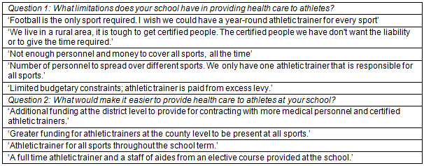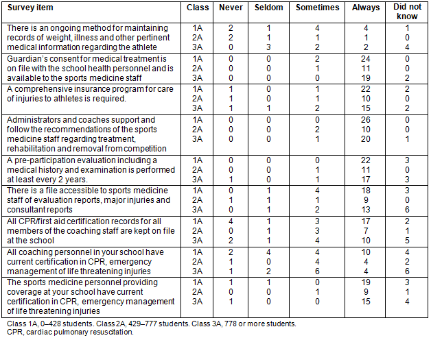 When responses were received, the statistical information was compiled and analyzed to determine completion of all questions. The Statistical Package for the Social Sciences for Windows v21.0 (SPSS; http://www.spss.com) was used to complete the statistical analysis. Descriptive statistics were gathered and analyzed for each of the individual questions in the instrument and were classified categorically into the recommendations provided in the NATA statement. In addition, all participants were given an opportunity to provide qualitative responses to open-ended questions, which were analyzed independently by three researchers for recurring themes. Only themes with 100% agreement among researchers were reported and discussed. Each respondent self-classified the school according to the class size of the West Virginia Secondary School Activities Commission classifications. Class 3A is identified as having 778 or more students, Class 2A is classified as 429-777 students, and Class 1A is classified as having 0-428 students.