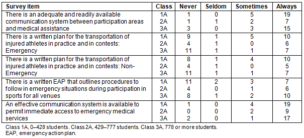 When asked if there was a written EAP that outlines procedures to follow in emergency situations during athletic participation, 36% responded 'never' and 38% responded 'always'. The majority (66%) reported that there was an adequate and readily available communication system between the athletic participation area and paramedical assistance. When asked if there was a written plan for the transportation of injured athletes in practice and in contests in an emergency situation only 38% responded 'always'. When asked if there was a written plan for the transportation of injured athletes in practice and competitions for contests in non-emergency situations an equal number of respondents (36%) responded 'never' and 'always' (Table 2).