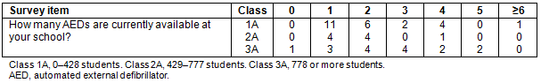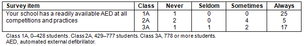 The majority (76%) reported that there was an AED readily available and one school reported there was no AED present on site. A majority of the participants stated their school had more than one AED on site (62%; Tables 3,4).