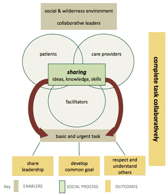 Research participants attributed sharing to the small team size, extensive time spent together, common vision, enthusiasm for wilderness medicine, and diversity of professional backgrounds. Three determinants found to be most deeply and frequently associated with collaborative interaction were 'wilderness and social environment', 'collaborative leaders' and 'basic urgent task'. This report will focus on the association with the wilderness and social environment. The data, analysis and reviewed literature are incorporated into the authors' analysis in accordance with Glaser's approach to presenting grounded theory12.