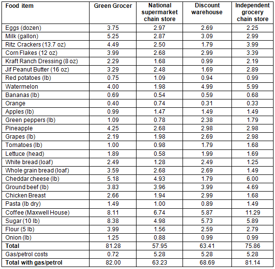 In addition, price comparisons were made to include the cost of gas/petrol for travel to the grocery stores. Estimates were calculated in US dollars at the cost when the survey was taken (US$0.63 per liter or US$2.40 per gallon). The rate of 8.5 km per liter (20 miles per gallon) was used, because this is the rate of the average American pick-up truck and sport utility vehicle, the most popular two vehicles in Alderson. The distance of a radius of 4.8 km (3.0 miles) was used to include the distance Alderson residents would travel to the Green Grocer.