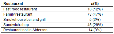 Restaurant survey: Alderson has four fast food restaurants: a family restaurant, a sandwich shop, a smokehouse bar and grill, and a fast food restaurant. An eight-item survey was designed to determine the food acquisition and customer sales for the restaurants. The survey determined how much of the restaurant food was supplied from local producers, and if this changed with the closing of the grocery store. The survey also determined if customer food sales changed with the grocery store closure, and if customers requested healthier foods due to the grocery store closing.