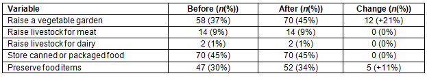 Home food production and storage was also recorded in the community member survey. Table 4 shows how home food production and preservation changed due to the emergence of the food desert. Although 12 families began gardening and 5 families began preserving food after the food desert, the change in proportions for these variables was not statistically significant (p=0.16, p=0.54 respectively). Nonetheless, the practical significance is that 17 families changed their food acquisition and storage practices due to the food desert.