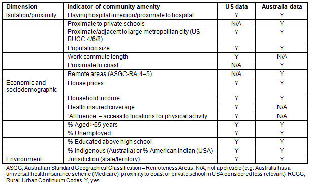 The full list of indicators of community amenity included in this study are summarised in Table 1. Data were collated from the American Community Survey (2011), Robert Wood Johnson Foundation (2014) and the Australian Census of Population and Housing (2011). Proximity measurements were calculated using straight-line distances between locations/communities using ArcGIS v9 software (ESRI; http://www.esri.com/arcgis).