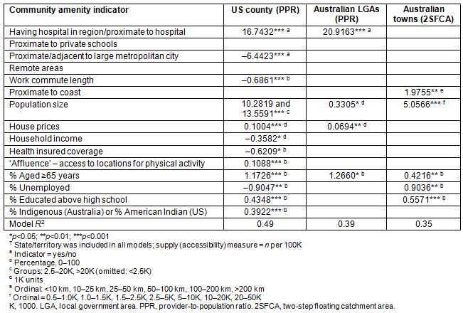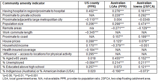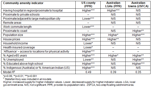 Table 2 summarises the strength of association between community amenity (as measured by the above indicators), and each of the three supply measures. Increased population size and having a nearby hospital are consistently positively associated with improved medical workforce supply (that is, regions without a local hospital also have poorer primary care supply). Additionally, communities with better educated residents, increased house prices, located near to the coast (Australia) and private schools (Australia), or with higher affluence (USA) were also associated with improved medical workforce supply. In contrast, communities that are most isolated in remote Australia or characterised with long work commutes (USA) and located in 'adjacent rural' areas (USA) had poor supply. The respective medical insurance systems appear to be associated with opposite supply levels, with Australia having higher supply in communities whose populations are older, and characterised by more unemployed residents or with poorer income, while the USA sees poorer supply in communities with similar population characteristics.