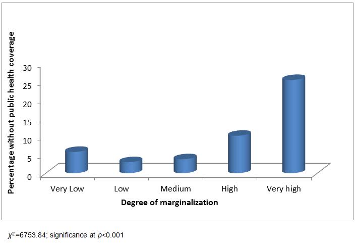 Figure 2: Distribution of population in terms of percentage without health coverage by degree of marginalization.