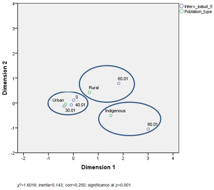 Finally, a correspondence analysis was performed to ascertain how the five intervals in each area of the study cluster. Figure 3 shows that interval 5, which involves the highest percentage without health services coverage (80.1% and above), is mainly related to the population located in the Indigenous area. Meanwhile, interval 60.1 to 80% is associated with rural areas, and the least affected interval in health services (0 to 30%) corresponds to the population in urban areas. Figure 3 clearly demonstrates how a lack of access to health services is an issue that mainly corresponds to populations living in rural and Indigenous communities.