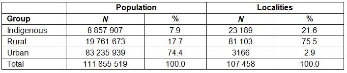 The Indigenous population represents 7.9% of the country’s total population and is found in 21.6% of all localities. The rural population comprises 17.7%, distributed among three-quarters of the localities. The three-quarters of the population who belong to the urban area are concentrated in 2.9% of the country’s localities (Table 1).