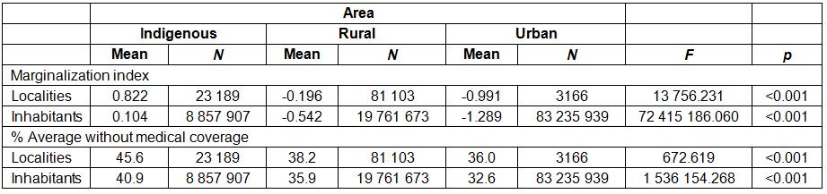 Significant differences were found among the mean levels of marginalization in the three areas of study (Indigenous, rural and urban). The Indigenous areas were the most marginalized and the urban areas the least (Figure 1). Similarly, each locality was analyzed according to its number of inhabitants in the three population types (Indigenous, rural and urban) and the significant differences were also found; in other words, to know the total number of inhabitants that have no health service coverage classified into Indigenous, rural and urban areas, we considered the total number of inhabitants independent of the number of localities. In the Indigenous and rural areas, marginalization is greater than in urban areas (Table 2). In relation to lack of medical coverage, the Indigenous area was the most disconnected from government health services. Nearly half of the population of Indigenous localities (45.6%) does not have access to medical coverage. The lowest percentage of persons not affiliated with health services occurred in the urban sector. These results are statistically significant. Similarly, Indigenous inhabitants were those with the highest percentage (40.9%) of non-eligible persons.