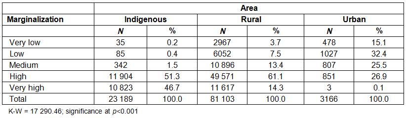 Comparing the degree of marginalization between the Indigenous, rural and urban populations, we found that 98% of the localities in the Indigenous areas and 75% of rural localities fell under the high and very high classification of marginalization. In the localities in urban areas, no polarization was found, and the highest percentages were distributed between low, medium and high marginalization. However, the very high marginalization was almost zero. The differences were statistically significant between the three areas (Table 3).