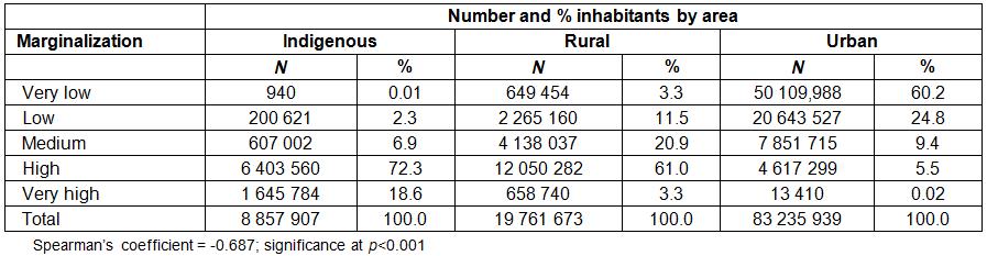 Significant differences between the three population areas – Indigenous, rural and urban – in relation to the degree of marginalization and access to health services were found. The present study confirms that the localities and inhabitants in the Indigenous area are the most marginalized and most deprived of health services and that urban areas are the least affected in this respect. Governmental policies aimed to overcome the lack of access to health service coverage should pay attention to rural populations with special emphasis on Indigenous areas.