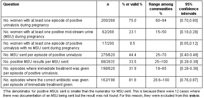 There were 250 charts of different women used in this analysis. An MSU was sent to pathology on the first visit for 79% (197/250) of women. (Range between communities: 58%-92%) (95% CI 0.74,0.84). Of the MSU sent, 15.7% (29/185*) were positive, (CI 95% = 0.10,0.21). (*There were 12 episodes where there was documentation of an MSU being sent to the laboratory but the result was not found during the audit. For this reason, they were excluded from this analysis).