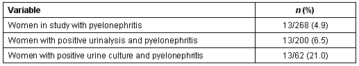 Pyelonephritis will occur in 1.8%-30% of woman who have non-treated asymptomatic bacteriuria during pregnancy6,18. In this study, it is difficult to accurately determine the percentage of women with asymptomatic bacteriuria who were not treated, because 56% of positive urinalysis samples were not sent to the laboratory for microscopy and culture and 68% of the women were not given immediate antibiotic treatment. So accurate comparisons cannot be made.