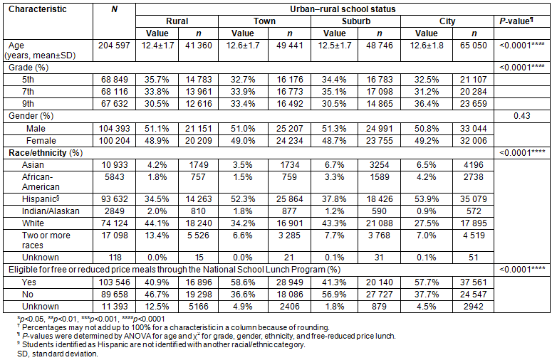 Table 1: Descriptive characteristic of participating students included in the California FITNESSGRAM data, 2010-2011 by urban-rural status (N=204 597)?