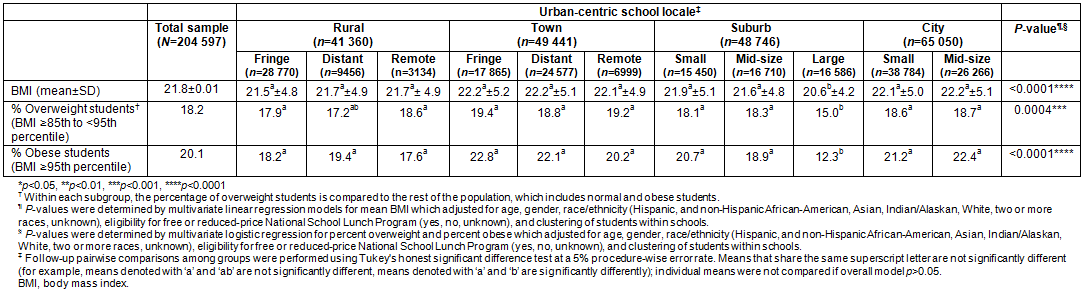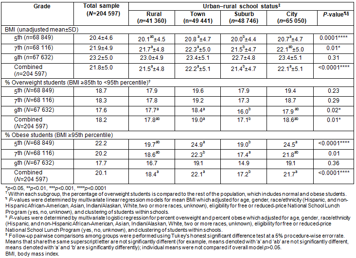 Centers for Disease Control and Prevention (CDC) growth charts were used to classify students as having a BMI at ³85th to <95th percentile (overweight) and ≥95th percentile (obese) for age and gender. The BMI data were cleaned using software developed by the CDC for detecting biologically implausible values, which resulted in the removal of 5224 cases based on biologically implausible values. An additional 59 cases were removed based on implausible age for grade values, and an additional 1474 cases were removed due to missing values for the ULOCAL variable. Multivariate analyses using a general linear model were conducted to compare differences in BMI between the geographic regions of the schools (city, suburb, town and rural) as well as the 11 ULOCAL subcategories; none of the schools were located in large cities. The percentage of students who were overweight and/or obese was compared by grade level, gender, and race/ethnicity across geographical regions using multivariate logistic regression models. Analyses were adjusted for student age, grade, gender, race/ethnicity (African-American, Asian, Hispanic, Indian/Alaskan, White, two or more races, or unknown), eligibility for free or reduced price meals, and clustering of students by school. When a stratified analysis was done, the variable of stratification (ie grade, gender, race/ethnicity) was not included among the covariates. When significant differences in BMI or prevalence of overweight or obesity were found between geographic regions, Tukey's method was applied to adjust for multiple comparisons at a 5% procedure-wise error rate. To evaluate whether the relationship of urban-rural status with the three dependent variables was different by grade, gender and race/ethnicity, the interaction of urban-rural status by each of the three predictors on each of the three dependent variables was examined (results not shown). Significant interactions were found for gender by urban-rural status with overweight as the outcome (p=0.03), and race/ethnicity by urban-rural status with obesity as the outcome (p=0.03). Although the remaining tests for interactions were not significant, results by grade, gender, and race/ethnicity are presented separately. The data were analyzed using Statistical Analytical Software v9.4 (SAS Institute; http://www.sas.com). A p-value at or below 0.05 was used to indicate statistical significance.