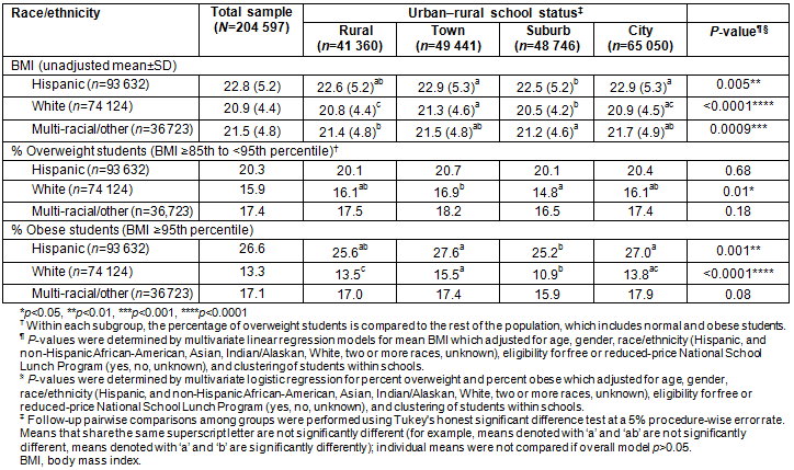 Table 4: Body mass index and overweight/obesity status by race/ethnicity for students in the California FITNESSGRAM data, 2010-2011 by urban-rural status