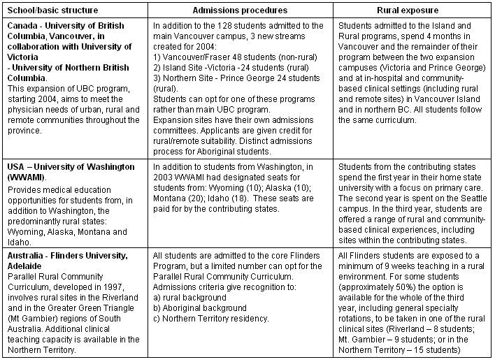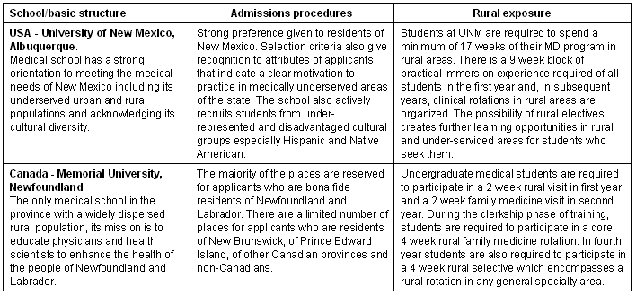 The schools break down into different types according to the extent to which their mandate may be defined as rural. Mixed Urban/Rural Schools are historically urban based schools which have expanded their mandate to address the needs of specific rural and remote jurisdictions with which they have developed relationships (Table 1). The examples chosen here are the University of Washington WWAMI program in the US, the expansion of the University of British Columbia program in Vancouver, Canada (UBC) and the Flinders University program in Adelaide, South Australia. DeFacto Rural Schools are schools with a mandate to serve geographic regions (province or state) with substantial rural populations, but they do not necessarily define their role as rural (Table 2). The examples used here are the University of New Mexico (UNM) in the US and Memorial University of Newfoundland in Newfoundland and Labrador, Canada. Stand Alone Rural Schools are new schools specifically created to meet the needs of defined rural and remote regions, the examples being James Cook University (JCU) in Queensland, Australia and the Northern Ontario School of Medicine (NOSM) in Canada (Table 3). The tables outline the basic structure, admissions policy and level of rural exposure of students for each of the different schools.