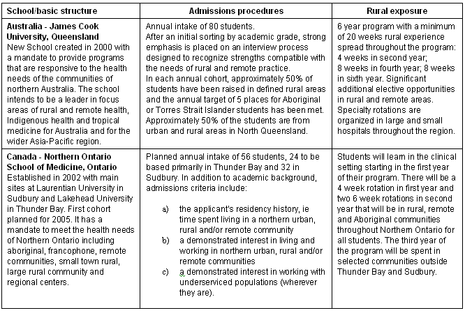James Cook University exemplifies a curriculum which places a strong emphasis on rural and remote health issues15. In addition to specific content, such as a semester-long course titled 'Rural, Remote, Indigenous and Tropical Medicine', the case materials, on which learning modules are based, reflect regional and rural health realities. A substantial part of the students' clinical training takes place in community-based settings and learning groups are led by group tutors who are mostly rural physicians. The rural focus is not limited to the family medicine components of the program, but extends to all areas of study. Similarly, NOSM has a newly designed curriculum in which Northern and Rural Health and Social and Population Health are two of the five themes that are woven through the whole four years of the program. Both of these new schools maintain that their goal is not just to produce rural physicians, but rather to take advantage of the health challenges of rural and remote environments to train students with superior skills that would serve them in a wide variety of contexts, both rural and urban.