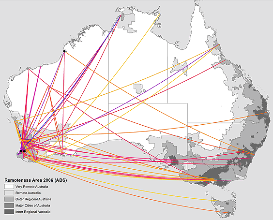 Figure 1: Rural-origin graduates' migration pathways from town of origin in Western Australia to town of principal practice location in 2014. Each origin location has been given a colour to allow to show flow direction.