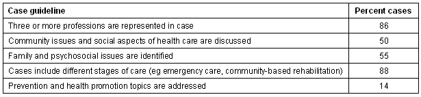 In 1996, faculty members developed a set of guidelines for students to adhere to in developing cases17. Students received instruction in using the guidelines to write effective cases. These guidelines reflected program objectives and all cases were expected to include the following dimensions: