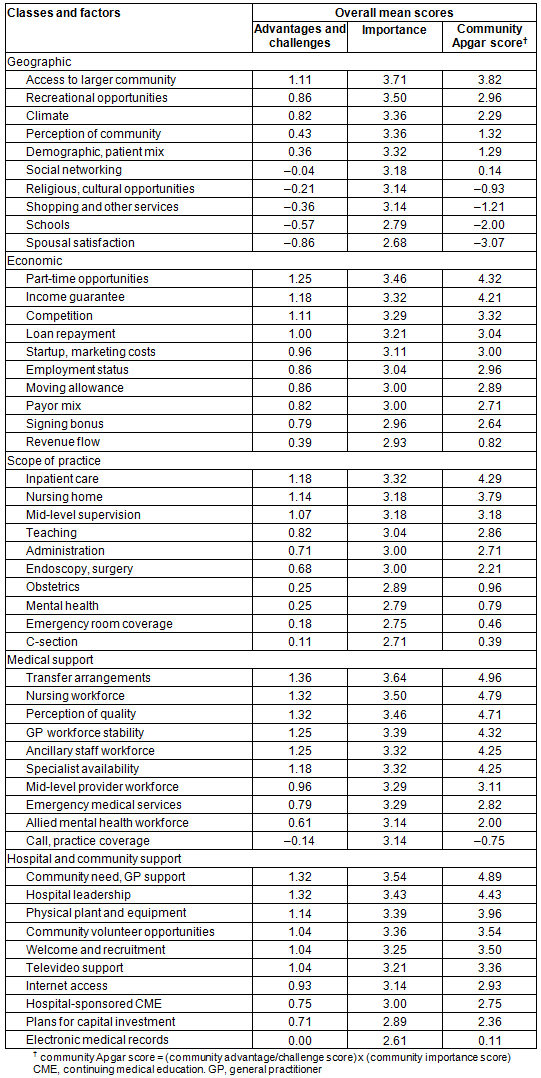 The bottom 10 CAQ factors were spousal satisfaction, schools, shopping and other services, religious/cultural opportunities, call/practice coverage, electronic medical records, social networking, caesarean section, emergency room coverage and obstetrics (Table 1).