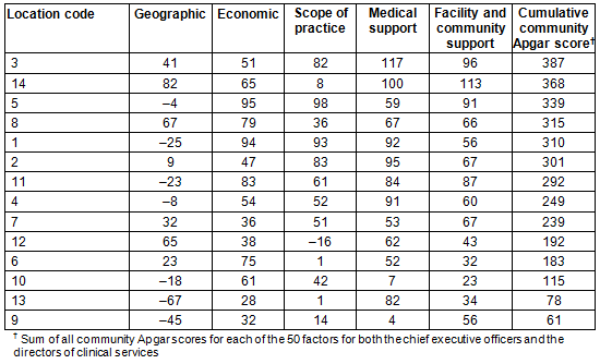 The community Apgar algorithm, derived from the community advantage/challenge score weighted by its relative importance, was calculated. The medical support class was identified as the highest community asset and capability followed by hospital/community support, the economic class, scope of practice and the geographic class. The top 10 CAQ factors were perception of quality, hospital leadership, nursing workforce, transfer arrangements, community need/GP support, GP workforce stability, part-time opportunities, inpatient care, ancillary staff workforce and specialist availability.