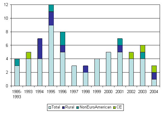 The same technology that is commonly used for university educational applications has the potential for bridging the urban-rural divide for the benefit of new and continuing health professions education1,2. The use of interactive and Internet-streamed video provides opportunities for professionals' education when working in rural and remote areas anywhere in the world. As shown (Fig 1), based on a bibliographic search of the Telemedicine Information Exchange (TIE), the use of this technology has grown rapidly3. Only 53 articles on distance-delivered health professional education (using various search terms) were published between 1985 and 2004 with the majority of applications for new education4. A few discuss distance delivery for education and specifically continuing-education (CE) applications5-9. This is curious, because nearly every telehealth program listed at TIE reports that they provide CE and continuing medical education, while a simple internet search reveals the frequent use of distance-delivery methods for CE. Perhaps those doing distance education as part of their health education programs do not consider it worth documenting. However, this lack of literature may have negative, unintended consequences. Even as the practice appears to be common, at least some funders seem reluctant to support it.