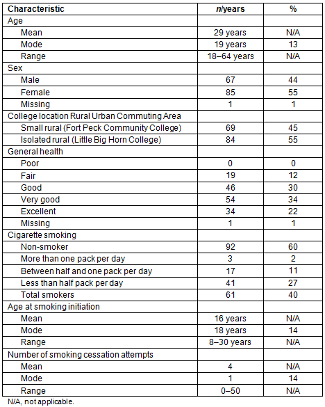 The mean age of eligible respondents was 29 years (range 18-64 years), and 85 (56%) were female. Eighty four (55%) studied at Little Big Horn College and 45% at Fort Peck Community College. One hundred and thirty four (88%) reported good to excellent health, 12% reported fair health and none reported poor health. The prevalence of self-reported current smoking was 40%. The mean age at smoking initiation was 16 years, with 90% of current smokers reporting initiation by the age of 18 years. Ninety six or 63% of all respondents responded to the 'age of initiation', indicating they had tried cigarettes at some point in their lives. Approximately two-thirds of smokers indicated that they smoked less than half a pack of cigarettes per day. The average number of quit attempts was four (range 0-50 attempts). Participant demographics and tobacco use are summarized in Table 1.
