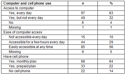 Most respondents (146 or 95%) reported having access to a computer, although one-third of those did not have daily access. Eighty-five (about 60%) of the 146 with computer access reported the ability to use a computer at any time. About 84% of all respondents reported spending 1 hour or more on the internet per day, and 93% reported using email, although two-thirds of those did not check email daily. Computer and cell phone access is summarized in Table 2.