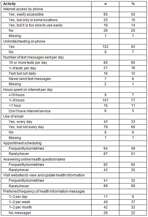 Across both sites, 131 respondents (86%) owned a cell phone, 98 (75%) of those had monthly plans, and 33 (25%) had prepaid plans. A total of 104 (80%) of cell phone owners reported having internet access on their phone. However, about 38% of those 104 individuals reported that internet access was either too slow to use easily or available only at certain locations in their community. A total of 122 (93%) of cell phone owners had unlimited text messaging, and the same proportion also reported at least occasional text messaging, with 65% texting 10 or more times per day.