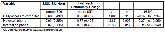 There were significant differences in cell phone ownership and internet capability on cell phones by site, with the more remote site reporting lower levels of both ownership and access to internet through their phones (t(151)=-2.87, p=0.005; and t(128)= -2.55, p=0.012, respectively) (Table 4).