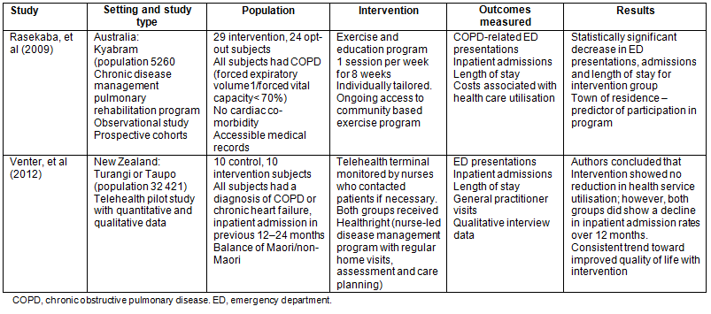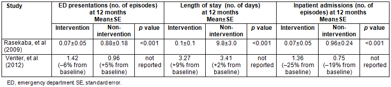 Table 2 summarises the findings of the two studies reviewed. Both interventions appear to positively influence a reduction in both ED presentation and inpatient admissions over a 12 month period. Interestingly, Rasekaba et al17 found that town of residence was a predictor of participation in the intervention they offered; participants living in outlying areas were less likely to participate.