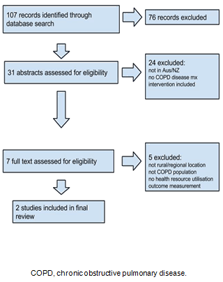 Limiting the scope of this review to include only studies that had outcomes related to health resource usage further reduced the number of studies available for review. Including studies measuring outcomes related to patient experiences and quality of life may have given a wider range of interventions available for review and a greater understanding of patient-related issues. Evaluation of these factors are particularly relevant in a rural and remote setting, where more complex issues relating to accessibility and coordination of services are known to exist. However, planning for new health services in rural and remote communities must consider financial efficiency as well as clinical effectiveness, particularly as hospital services in rural and remote areas face higher fixed costs of operation. The present review did not specifically address issues related to indigenous health as these were not raised in the studies that met inclusion criteria. Other factors having the potential to impact on care received by those with COPD in rural and remote areas, such as the knowledge and skills of health practitioners20, were not considered.