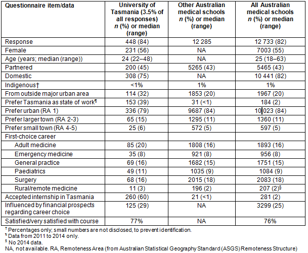 The early career contribution to the local workforce of the medical program was explored through analysis of data from exit questionnaires administered to five consecutive cohorts of graduates, from 2010 to 2014, as part of the Medical Schools Outcomes Database project2. The data included demographic information, geographic and specialty career preferences, and interest in working in Tasmania. These data are presented in Table 1, comparing graduates from the University of Tasmania with those from both other Australian medical schools and all Australian medical schools combined, including Tasmania.