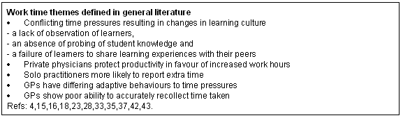 Both rural and urban GPs consistently report time pressure when supervising medical students8,38. Despite exceptionally heavy workloads more than 75% of rural GP preceptors reported spending an average of two additional hours at work on each full day of precepting12. This is somewhat greater than was found in the studies which were not specifically rural15,35. Several themes related to work time have been described across all studies. These are set out (Fig 1).