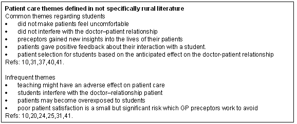 GPs almost universally stated that patient care remained their primary responsibility, and that this was compatible with precepting students46. Rural and urban studies concluded that a majority of preceptors feel that precepting improved the quality of their clinical practice31. Themes explored in the non-rural literature are summarised (Fig 2). No rural-specific data were found.