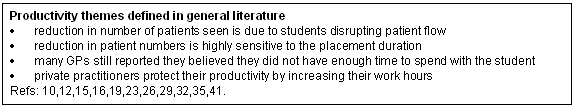 Accommodating time needed to teach diminished the number of patients seen per clinic session19. Most rural and urban GPs described a reduction of 6-10 patients per day or 1-2 patients per hour12. Further exploration of productivity is found in mainly urban-based studies (Fig 3).