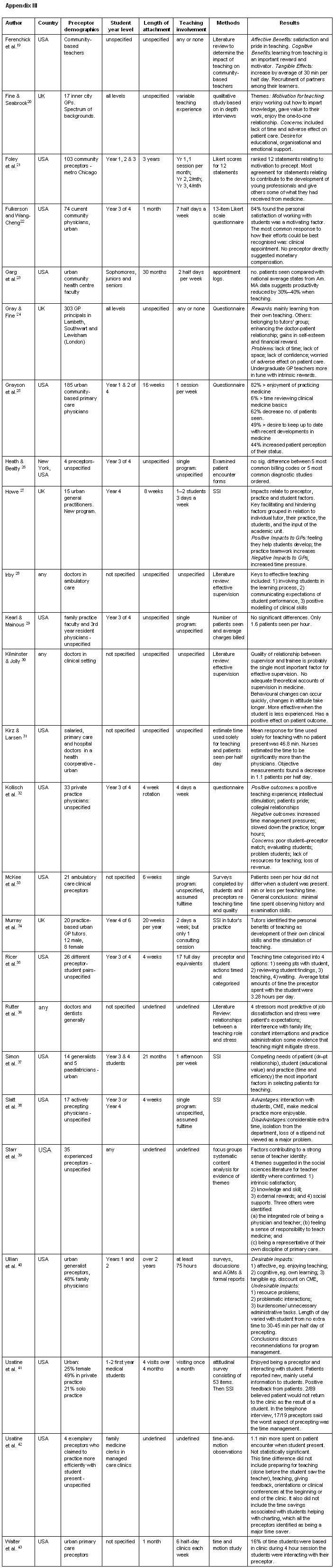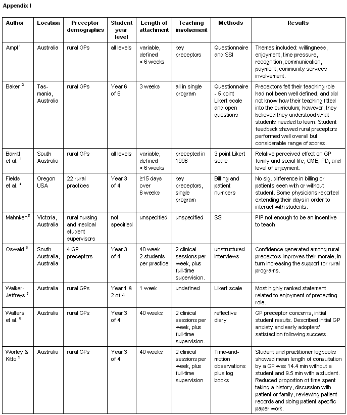 In total 43 articles studying preceptors in Australia, UK and USA were included in the final review, nine of which studied solely rural GPs (Appendix I1-9), nine studied a mix of both urban and rural preceptors (Appendix II10-18), and the remaining 25 were solely urban (Appendix III19-43). Of the articles found, four were literature reviews and 39 were original research articles or reports. Fourteen of these articles related to GP preceptors generally and 29 related to preceptors involved in specified types of student attachments or specific medical school programs. Only 16 articles clearly defined the length and nature of student clinical attachments with which GPs were involved.