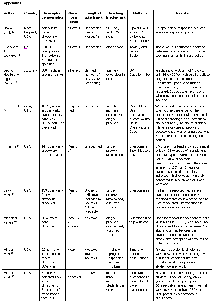 Because the nature of general practice has changed over time, only articles from 1984 to May 2004 were considered. Any articles involving the impact of medical students on doctors, which did not involve supervision in a clinical setting, were excluded. Articles voicing individual opinions of impacts on GPs, even if considered 'expert', were excluded. This resulted in the exclusion of program descriptions where authors' references to impacts on GPs were not clearly based on empirical findings using quantitative or qualitative research methods.