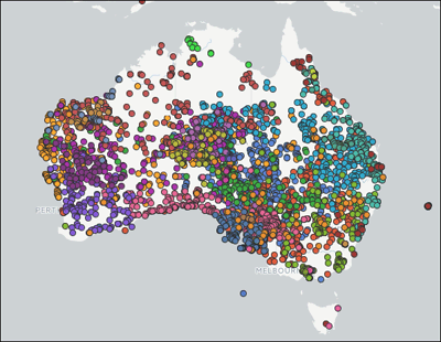 Figure 1: Dispersal areas of the 22 species and four subspecies of Australian Nicotiana8. The map illustrates the heavier dispersal through the central area of Australia, with a range of species growing throughout that region.