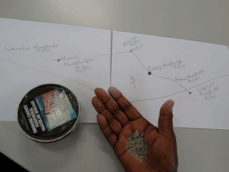 Figure 3: Mingkulpa being mixed with ash in the palm of the hand prior to mastication. The background sketch identifies some preferred collection locations in southern central Australia; the metal tin is a preferred mingkulpa and ash-carrying container. (AR own photo with permission of Janet Inyika.)