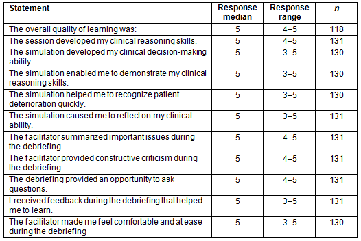 Respondents reported that the overall quality of learning was excellent, and that the simulation developed clinical reasoning skills and decision-making ability, helped in recognizing patient deterioration quickly, and allowed for self-reflection. The debrief summarized important issues, provided constructive criticism, and the feedback helped participants to learn.