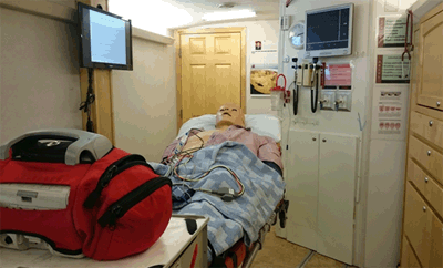 The Shock Trauma Air Rescue Service (STARS) MEU (Fig1) is a motorhome that has been converted to a medical simulation lab. 'Stan', the high fidelity mannequin (CAE Healthcare, Saint-Laurent, Quebec) in the MEU, speaks, breathes, blinks, and has reactive pulses and pupils. It mirrors patient responses to such procedures as CPR, intravenous medications, intubation, and ventilation.