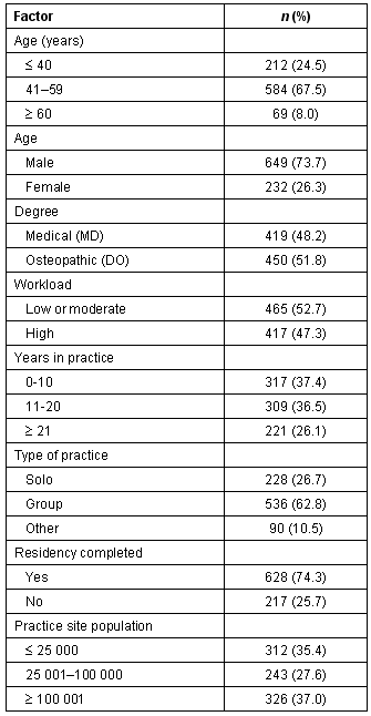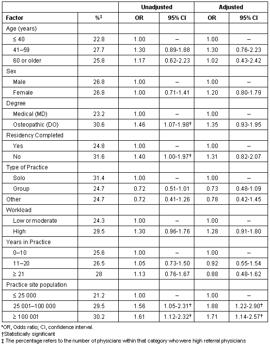Demographic and professional characteristics of survey respondents were summarized using numbers (percentages) for each categorical variable. The referral rate to specialty physicians was self-reported as one of the following categories: 2% or less, 3-4%, 5-6%, 7-8%, 9-10%, 11-12%, 13-14%, and 15% or more. Logistic regression was then used to compute crude and adjusted odds ratios (OR) and 95% confidence intervals (CI) for factors associated with high levels of physician referral. For these analyses, high referral was determined to correspond to approximately the top quartile of responses (11% or greater). Potential confounders that were controlled in these analyses included age, gender, professional degree, residency completion status, type of practice, self-reported workload, years in practice, and practice site population. Analyses were performed with the SYSTAT statistical software package (Systat Software Inc, Richmond, CA, USA), using p = .05 as the criterion for statistical significance.