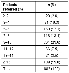 Eight hundred eighty-two (37%) surveys were returned. The demographic and professional characteristics of respondents are presented (Table 1). The distribution of reported physician referral is presented (Table 2). The unadjusted and adjusted factors associated with high referral are presented (Table 3). After adjustment for confounding variables, the only category significantly associated with high referral rates was the population of the practice site. A physician practising in a city with a population of 25 001-100 000 was 1.88 times (75% CI, 1.22 -2.90) more likely to be in the high referral rate category than a physician in a town of fewer than 25 000 people. Physicians in cities of more than 100 000 were 1.71 times (95%, CI, 1.14-2.57) more likely to be in the high referral category than their peers in towns of less than 25 000.