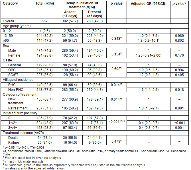 Statistical analysis was done using Stata v13.0 (StataCorp; http://www.stata.com). Descriptive analysis was conducted to examine the demographic and clinical characteristics of the patients and presented as a proportion (95% confidence interval (CI)) and mean (±2 standard deviations (SD)) wherever applicable. Treatment outcome was dichotomised into favourable (cure or treatment completed) and unfavourable (default from treatment or failure) treatment outcome. Initial sputum smear results were categorised as negative, low positive ('1+' and '2+') and high positive ('3+' and '4+'). Bivariate and multivariate logistic regression was performed to identify independent predictors of delay in initiation of treatment (>7 days), with age, sex, caste, village of residence, treatment category and initial sputum smear positivity taken as explanatory variables. Multivariate analysis was done to study the effect of delay in initiation of treatment on treatment outcome, unadjusted as well as adjusted for all other explanatory variables. Results were reported as odds ratios (OR) with 95%CI. p<0.05 was considered statistically significant.