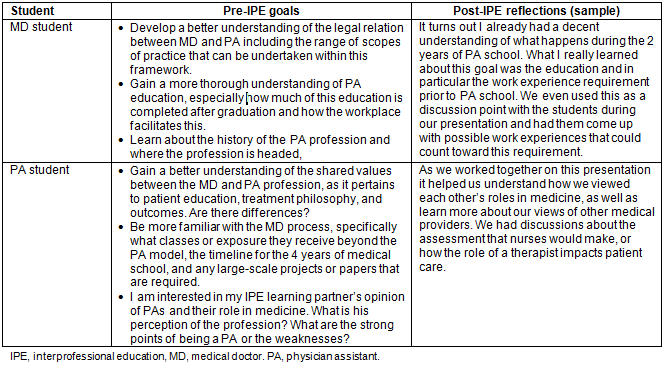 The MD student and the PA student participated in the Med-PARR in June 2015 at a rural family practice clinic in Oregon. The goals for each student are shown in Table 1. For their community projects these students decided to do a health professions career day at a local secondary school that entailed co-presenting to secondary school students about what each of their respective professions and other healthcare professionals (eg nurse, medical assistant) did and how they worked together in the clinical setting. They concluded their session with a suture workshop where both the MD and PA students demonstrated suturing techniques, using pig's feet, and coached the secondary school students to practice their own sutures.